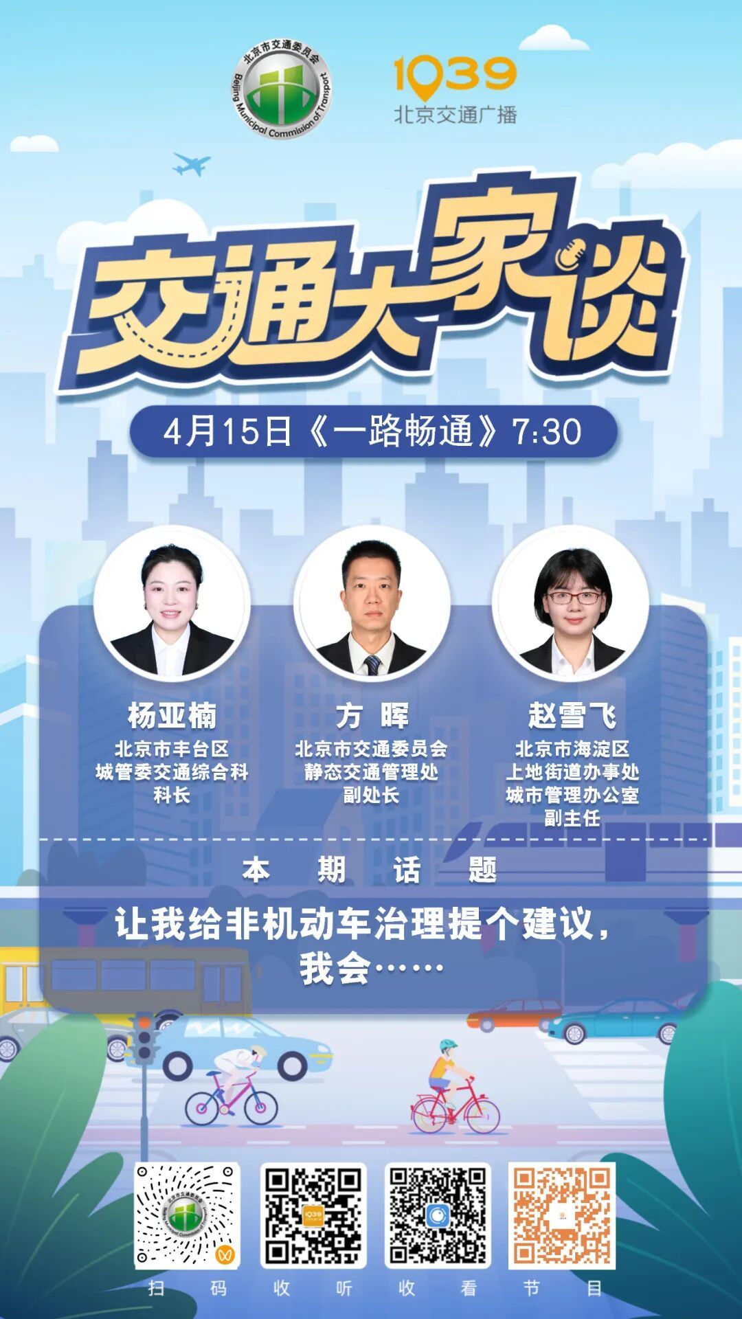 非机动车是市民绿色出行的重要方式,但随之而来的停放乱象已成为城市治理的“老大难”。北京交通广播《一路畅通》“交通大家谈”节目,特邀北京市交通委员会静态交通管理处副处长方晖、北京市丰台区城管委交通综合科科长杨亚楠、北京市海淀区上地街道办事处城市管理办公室副主任赵雪飞分别从市级政策、园区型街道实践、枢纽型城区实践三个维度,分享治理经验与创新举措,回应市民关切。