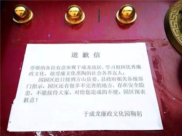 然而,在此前赴吕梁采访期间,记者也注意到,比起电视剧的热度,于成龙廉政文化园好一个凄凉,大门紧闭,门口贴了方山县政府各种要求整改的文件和于成龙廉政文化园的道歉信。