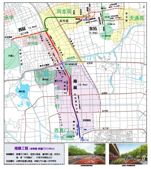 自行车专用路南展起点是后厂村路与上地东路的交叉口,向南一直到西直门大街,全长14.1公里,将分两期实施,第一期从后厂村路到北四环,全长8.6公里;第二期从北四环到西直门外大街,全长5.5公里。