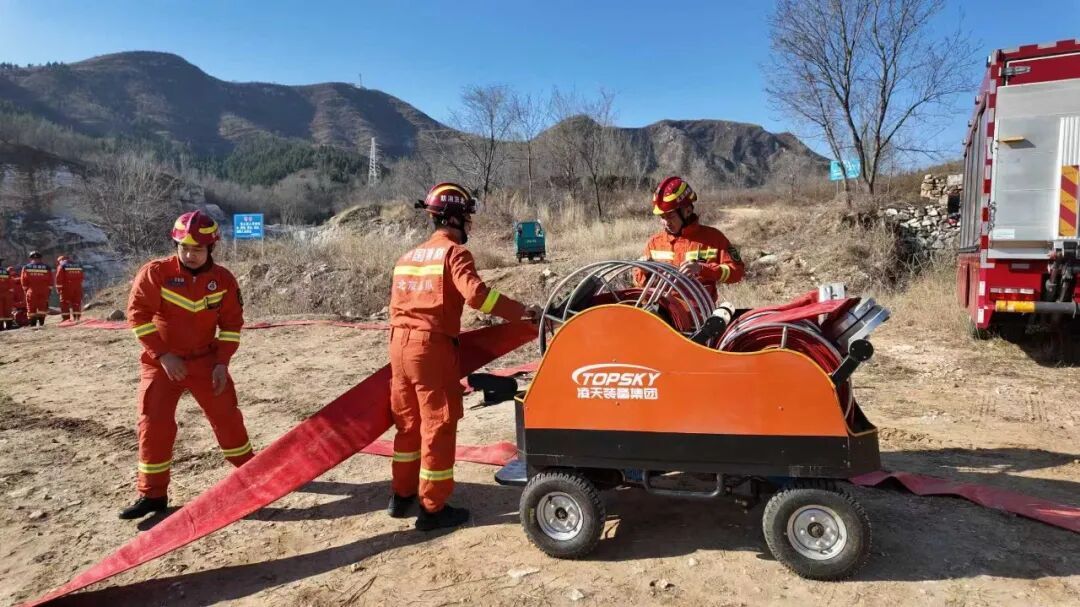 此次演练紧贴实战背景,模拟了山林火灾远距离供水的复杂场景。针对房山辖区山林地形崎岖、天然水源分布零散的特点,分别设置了五个演练科目:从利用全地形机器人在复杂水域远程抽水,到手抬机动泵在山地间的接力供水;从消防水车向森林消防专用车辆的跨装备输水,到登山铺设水带进行高海拔灭火,最后再到前线通信指挥组网的建立与保障。