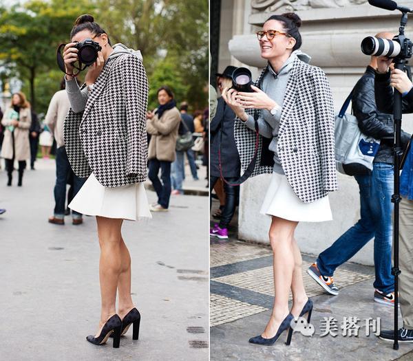 西装款的千鸟格整体穿着,可能有些令人炫目,但是如果把千鸟格元素应用在小西装上,搭配小短裙,一样能让你美到窒息令人着迷。千鸟格相比其他的普通大格子,多了一股文雅的气息,时髦又有腔调!▲