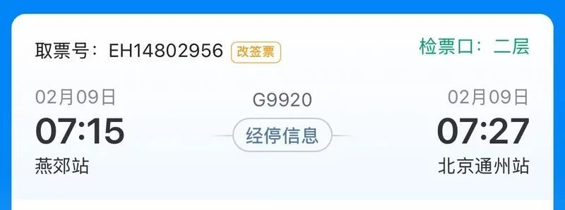 7点15分,列车准点启动,朝着北京通州站疾驰而去。据了解,京唐城际铁路在2025年12月30日全线贯通,全长约149公里,最高设计时速350公里,而我乘坐的这趟列车从燕郊到通州只需12分钟。