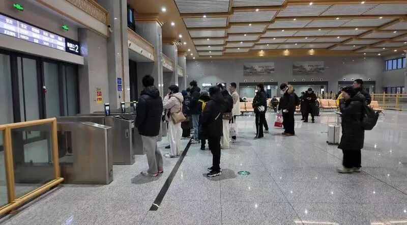 记者:现在我们的候车大厅已经聚集了越来越多的往北京通勤的人,我们现在可以看到这里有4个安检通道,其中一个是绿色通道。我现在准备拿着身份证配合人脸识别,准备安检、进站。