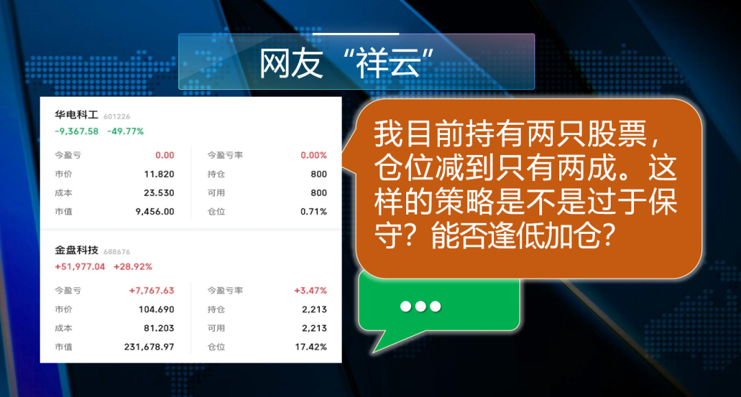 观众“祥云”留言:我目前持有两只股票,仓位减到只有两成。现在这样的策略是不是过于保守?能不能逢低加仓股票?