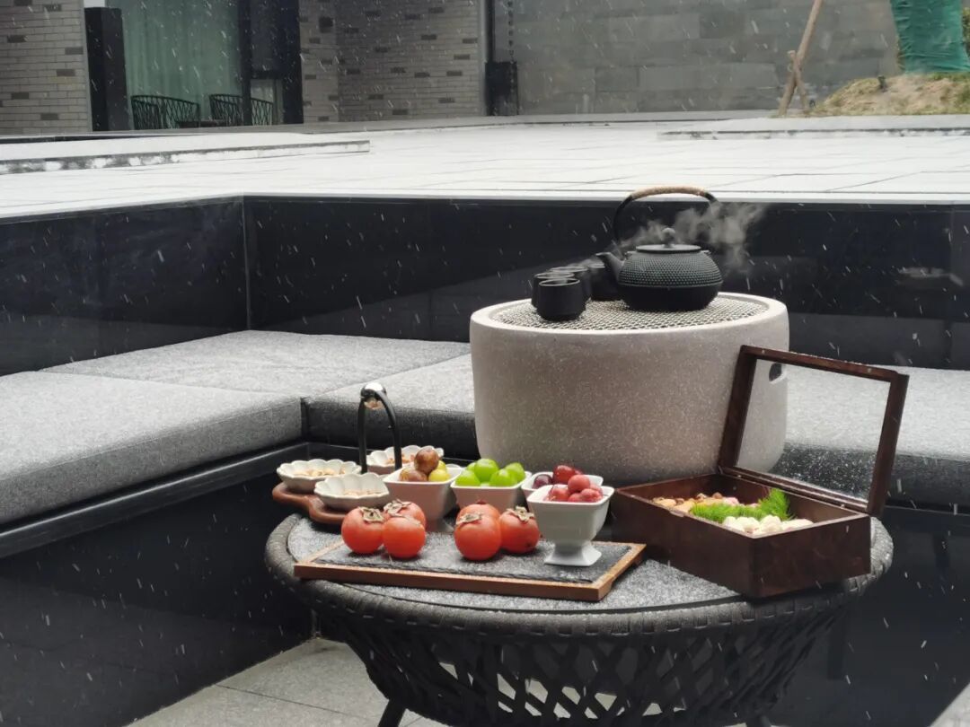 也可以在观景露台,一边欣赏雪景,一边体验“柿柿如意”围炉煮茶,感受京味茶点与鲜果,商务洽谈和老友情谊都在山水为幕间升温。