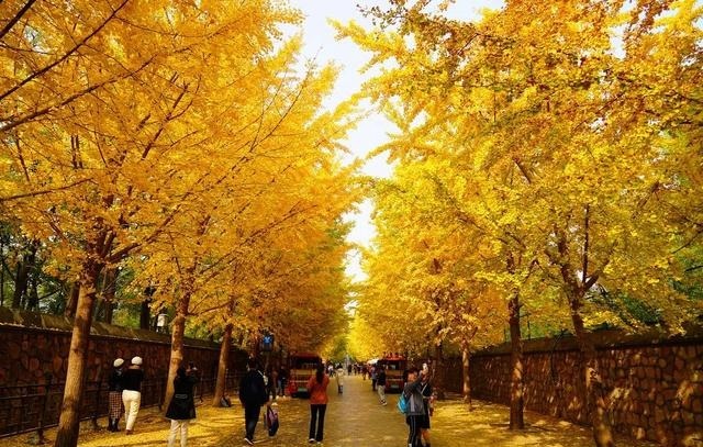 中山公园社稷坛南侧有一条银杏大道。这里有18株树龄在50年左右、树干直径达30至40公分的银杏树。深秋时节,银杏树叶变成金黄色,给地面铺上一层“金色的毯子”。