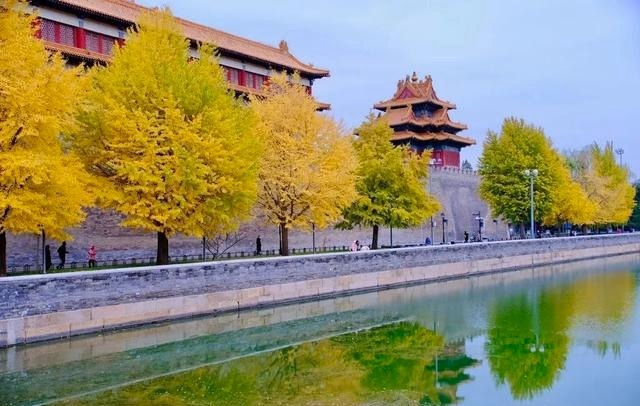 近日,故宫角楼旁的银杏树叶已变金黄,不少路过的市民游客驻足欣赏。
