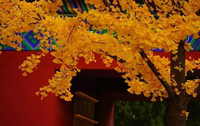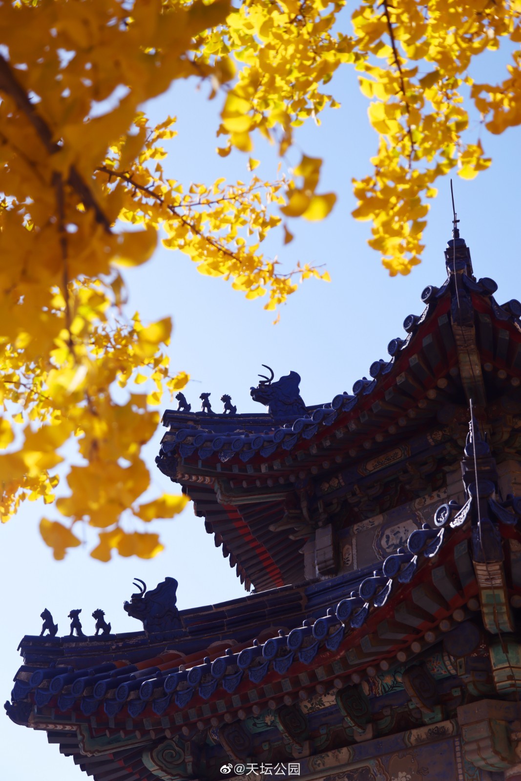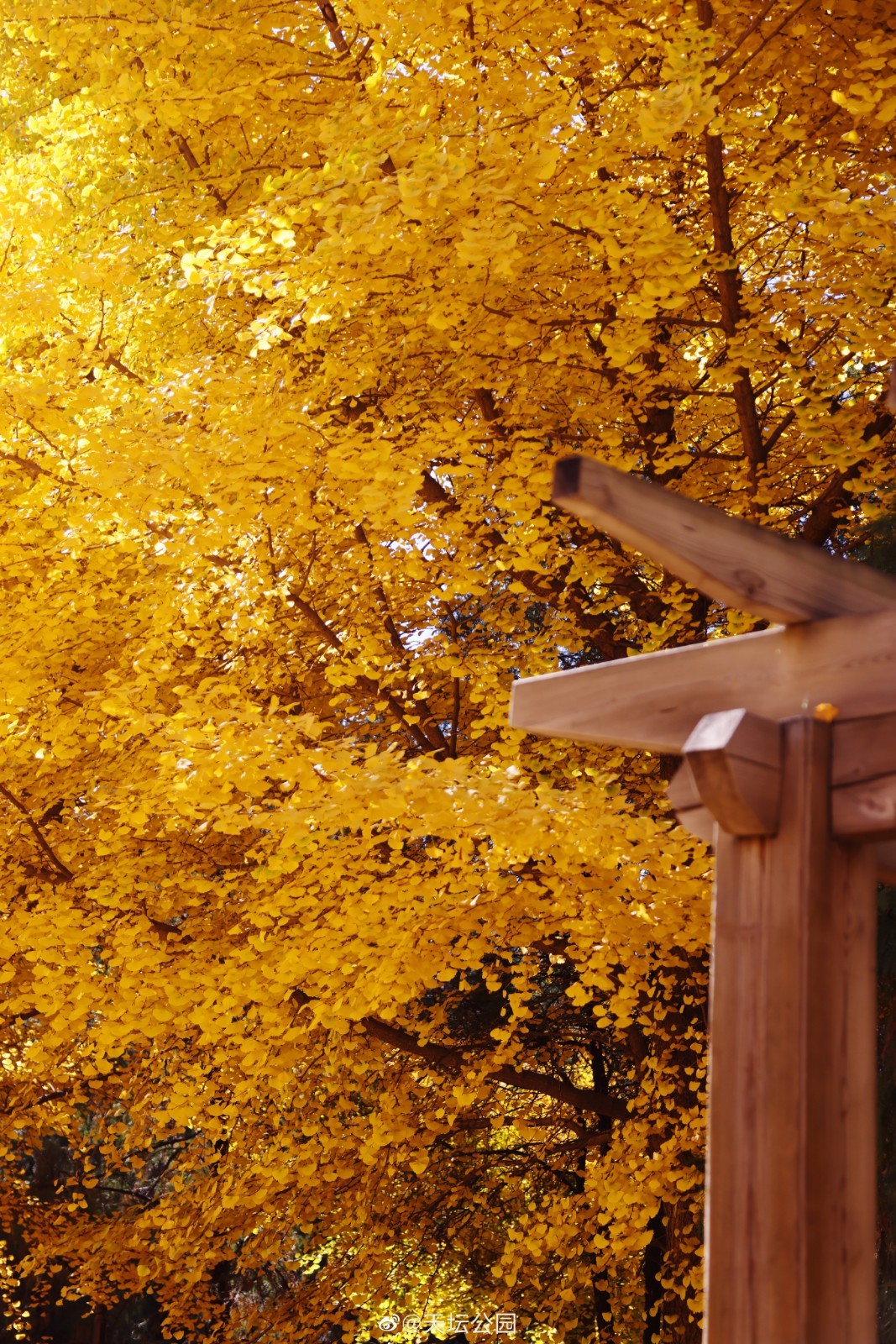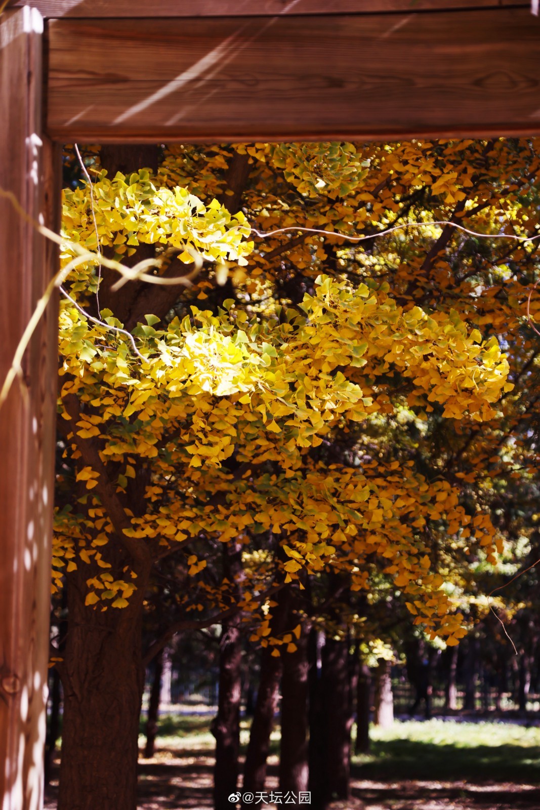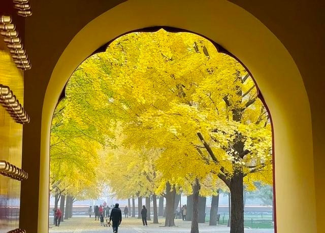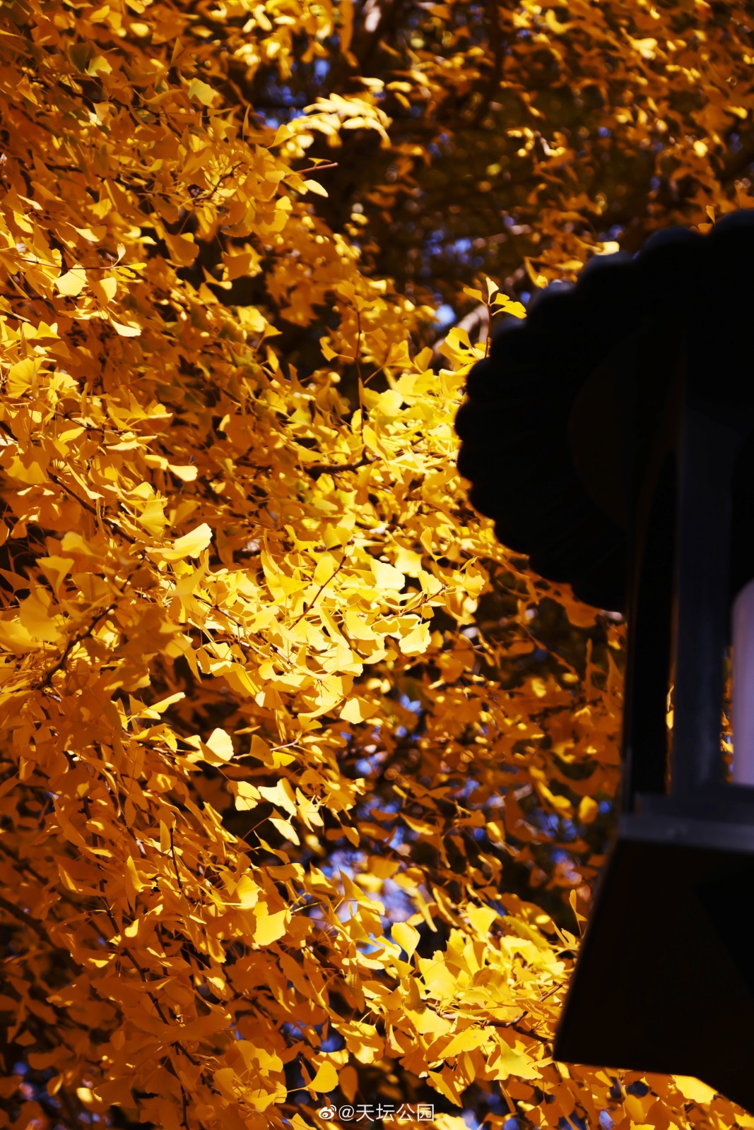 深秋时节,天坛公园内东北角以及北天门内路两边上百棵高大的银杏树纷纷披上“黄金衣”,金黄色的银杏树在园中红墙和祈年殿的映衬下,大气而庄重。
