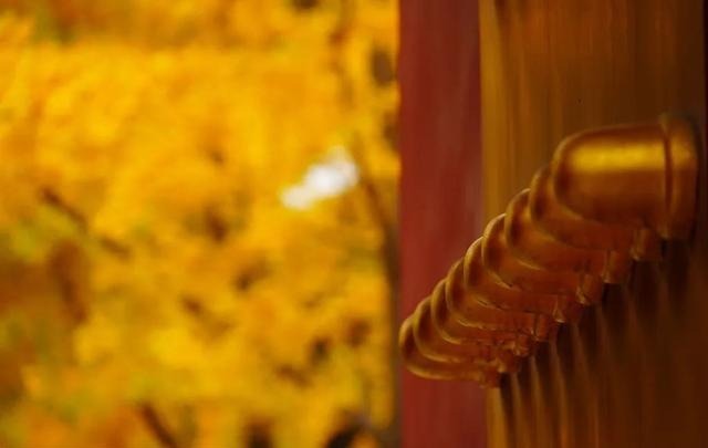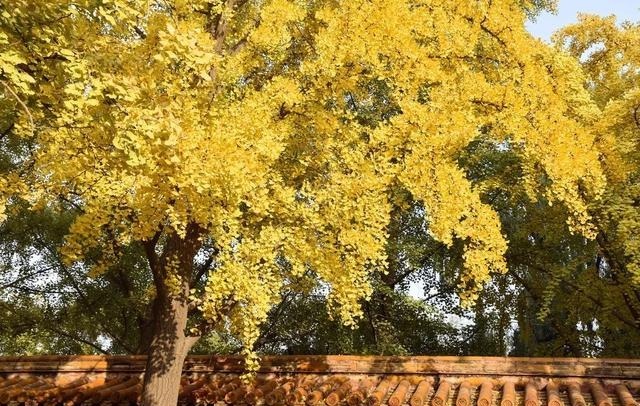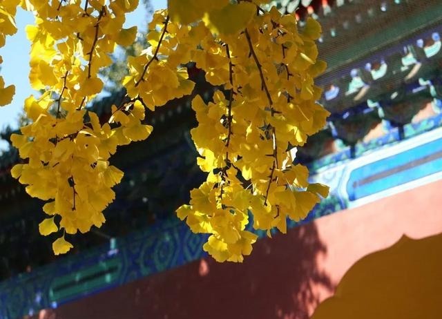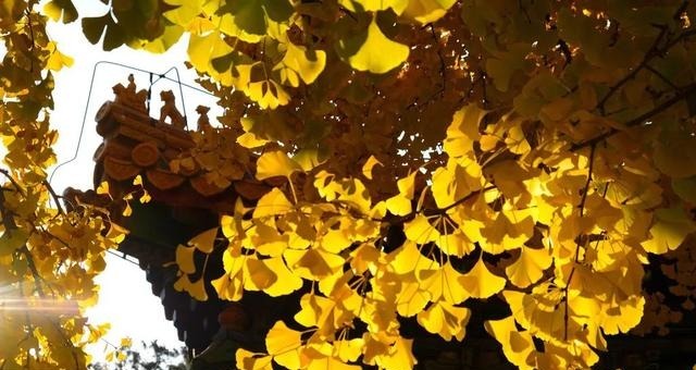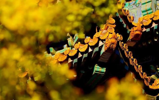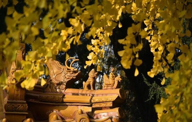 古建筑与银杏叶交相辉映,屋顶脊兽藏匿于金黄的银杏叶之中,别有一番风味。