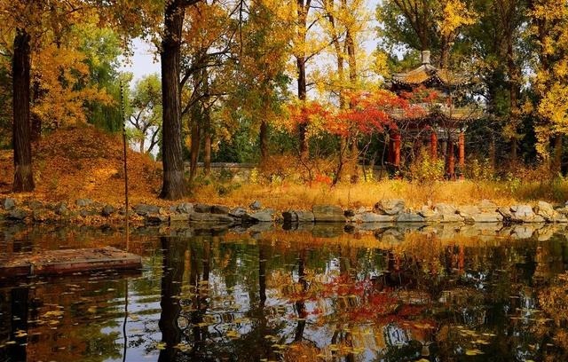 为了给游客营造更好的游园体验,圆明园实行落叶缓扫措施,暖黄色的叶片铺满路面,形成一条“金色走廊”,秋风吹过,片片黄叶盘旋飘落,如梦似幻。