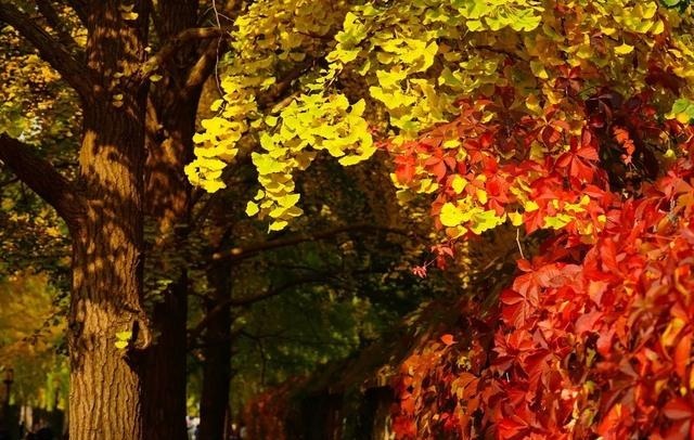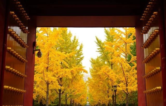 天坛公园北天门内路两边栽有60余棵银杏树,树干高大,枝繁叶茂。金色银杏树在红墙掩映、古柏森然的烘托下,形成一条迷人的“黄金走廊”,游客漫步其间,可饱览金秋美景。