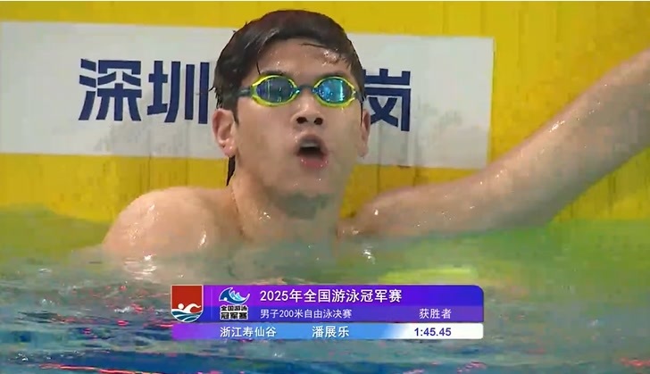 5月19日晚,2025年全国游泳冠军赛男子200米自由泳决赛在深圳大运中心游泳馆进行。潘展乐以1分45秒45的成绩赢下这场云集三位奥运冠军的激情之战,收获个人本次比赛第二枚金牌。