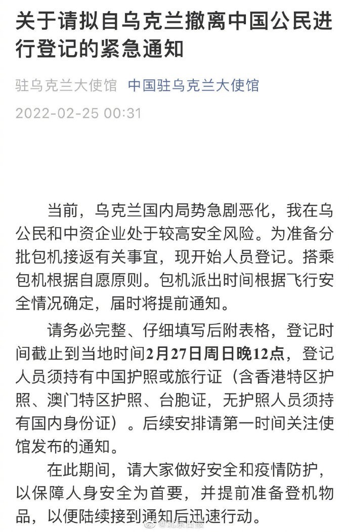 2月25日,我国驻乌使馆发布中国公民登记撤离通知:当前,乌克兰国内局势急剧恶化,我在乌公民和中资企业处于较高安全风险。为准备分批包机接返有关事宜,现开始人员登记。搭乘包机根据自愿原则。包机派出时间根据飞行安全情况确定,届时将提前通知。登记时间截止到当地时间2月27日周日晚12点,登记人员须持有中国护照或旅行证。