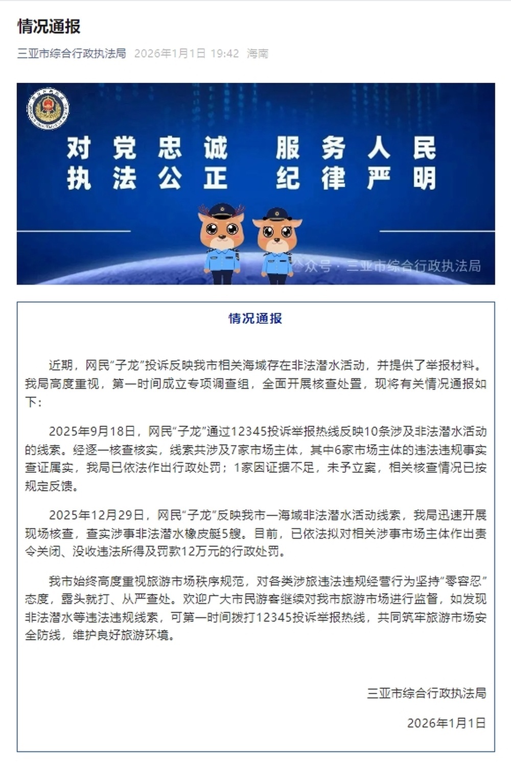 2025年9月18日,网民“子龙”通过12345投诉举报热线反映10条涉及非法潜水活动的线索。经逐一核查核实,线索共涉及7家市场主体,其中6家市场主体的违法违规事实查证属实,我局已依法作出行政处罚;1家因证据不足,未予立案,相关核查情况已按规定反馈。