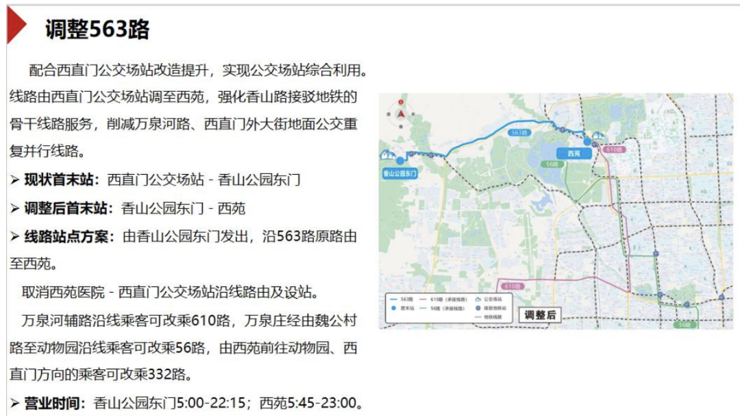 此次调整中,为配合西直门公交场站改造提升,实现公交场站综合利用,拟调整563路,线路由西直门公交场站调至西苑,强化香山路接驳地铁的骨干线路服务,削减万泉河路、西直门外大街地面公交重复并行线路。
