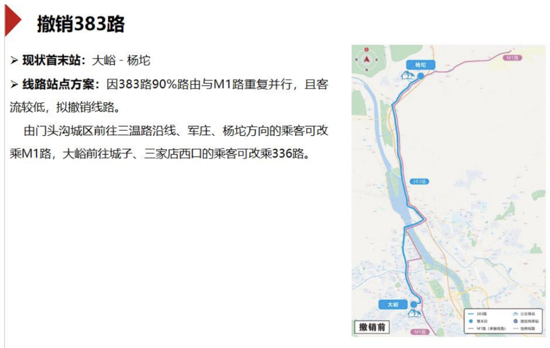 该方案还涉及两条公交线路的撤销。其中,383路(首末站为大峪至杨坨)90%路线与M1路重复并行,且客流较低,拟撤销线路。