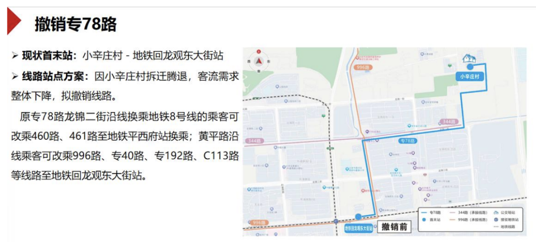 因小辛庄村拆迁腾退,客流需求整体下降,拟撤销专78路(首末站为小辛庄村至地铁回龙观东大街站)。