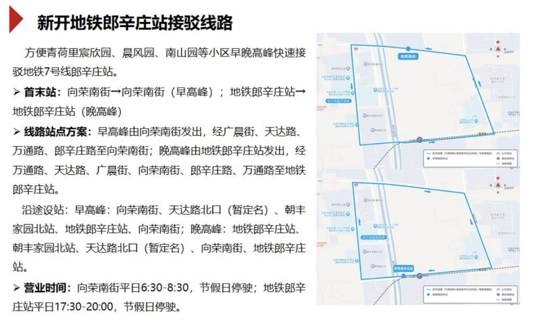 根据调整方案,拟新开地铁郎辛庄站接驳线路,方便青荷里宸欣园、晨风园、南山园等小区居民早晚高峰快速接驳地铁7号线郎辛庄站。