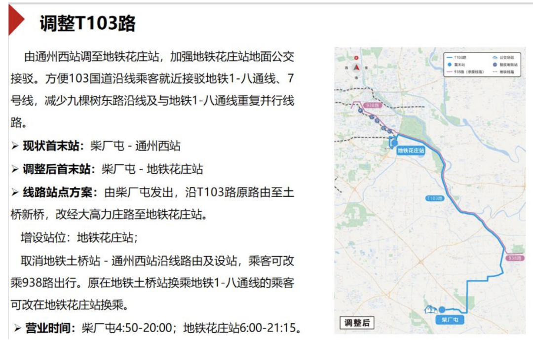 为了方便103国道沿线乘客就近接驳地铁1号线-八通线、7号线,拟调整T103路,线路由通州西站调至地铁花庄站,加强地铁花庄站地面公交接驳,同时减少九棵树东路沿线及与地铁1号线-八通线重复并行线路。