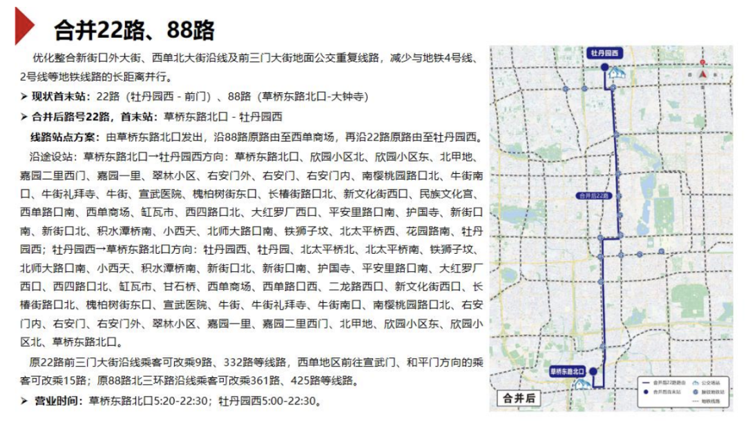 此次调整中,拟合并22路、88路,优化整合新街口外大街、西单北大街沿线及前三门大街地面公交重复线路,减少与地铁4号线、2号线等地铁线路的长距离并行。合并后路号为22路,线路由草桥东路北口发出,沿88路原路线至西单商场,再沿22路原路线至牡丹园西。