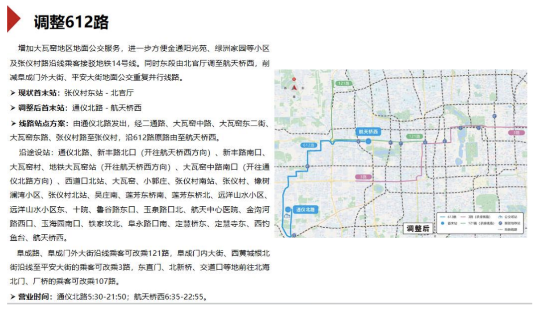 同时,拟调整612路,增加大瓦窑地区地面公交服务,进一步方便金通阳光苑、绿洲家园等小区及张仪村路沿线乘客接驳地铁14号线。同时,线路东段由北官厅调至航天桥西,削减阜成门外大街、平安大街地面公交重复并行线路。
