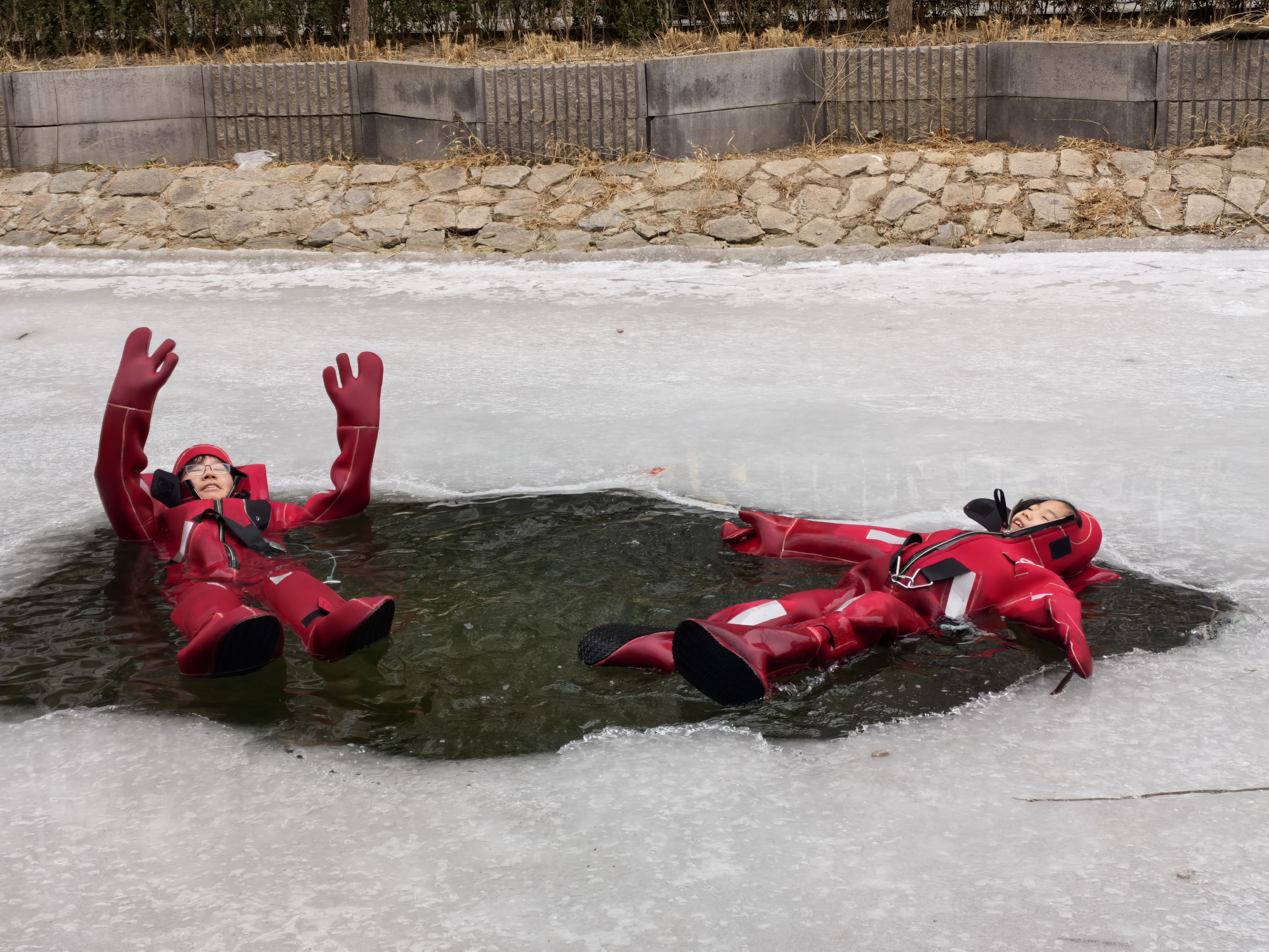 冰面救援时,队员特别容易失温,穿上干衣之后就不会丧失活动能力。除了干衣之外,队员还会加一件漂衣,以保证安全。“干衣很严实,但如果泡的时间太长,比如一个小时以上,也有可能渗水。”何昆说,所以他们通常采用“阶梯式救援”,也就是一组人下水15分钟后,换另一组。