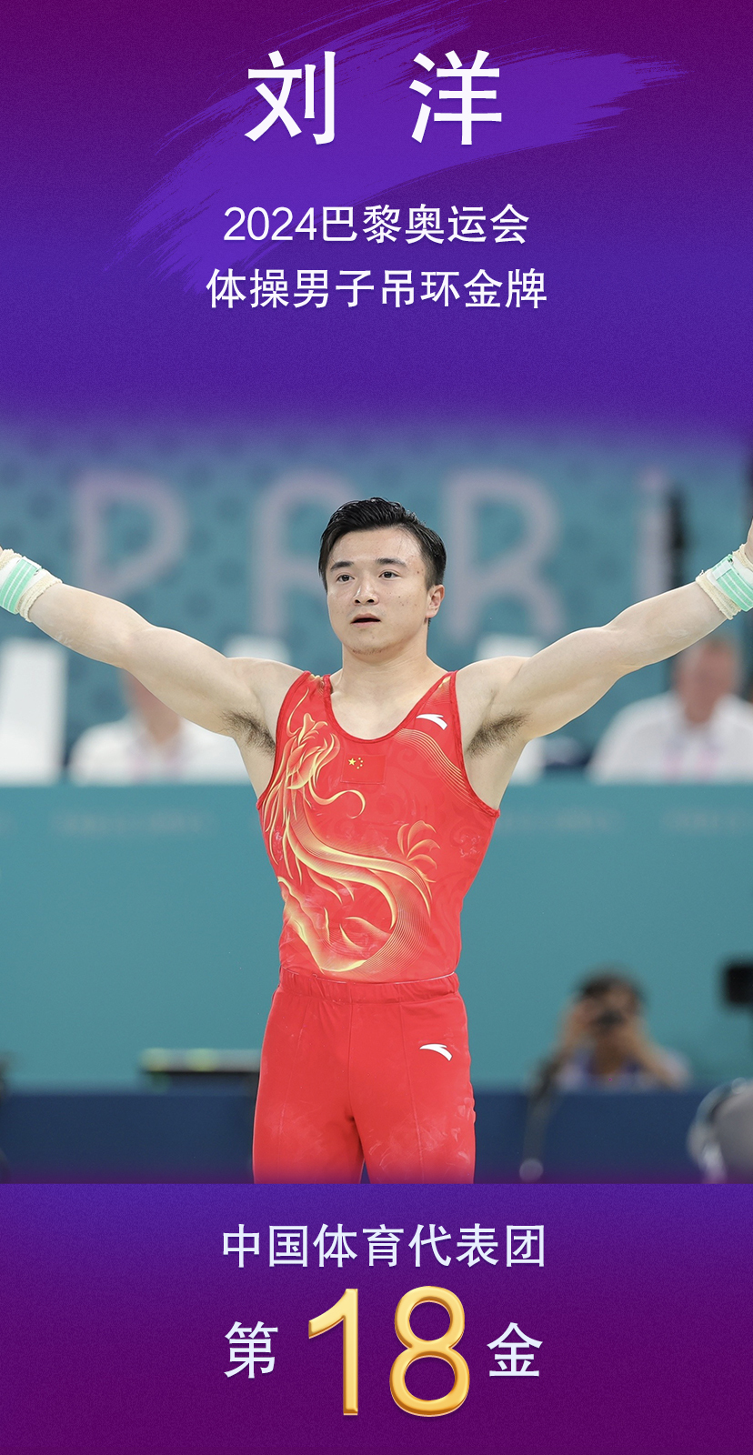巴黎当地时间8月4日下午,巴黎奥运会体操男子吊环决赛在贝尔希体育馆举行。东京奥运会冠军、中国选手刘洋以15.300分夺得冠军,成功实现卫冕。这是中国队在巴黎奥运会体操项目上收获的首枚金牌,刘洋也成为了奥运会历史上第三位夺得两枚男子吊环金牌的运动员。
