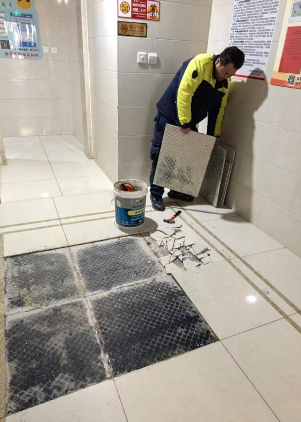 社区“我来办”工作站第一时间在现场设置临时警示标识,同步联系物业安排维修。为最大限度减少对居民出行的影响,施工特意选在出行低峰时段进行。维修人员将空鼓地砖小心拆除,清理基层后重新找平、铺贴,确保地面牢固平整。社区工作人员全程跟进,确保维修作业安全有序。