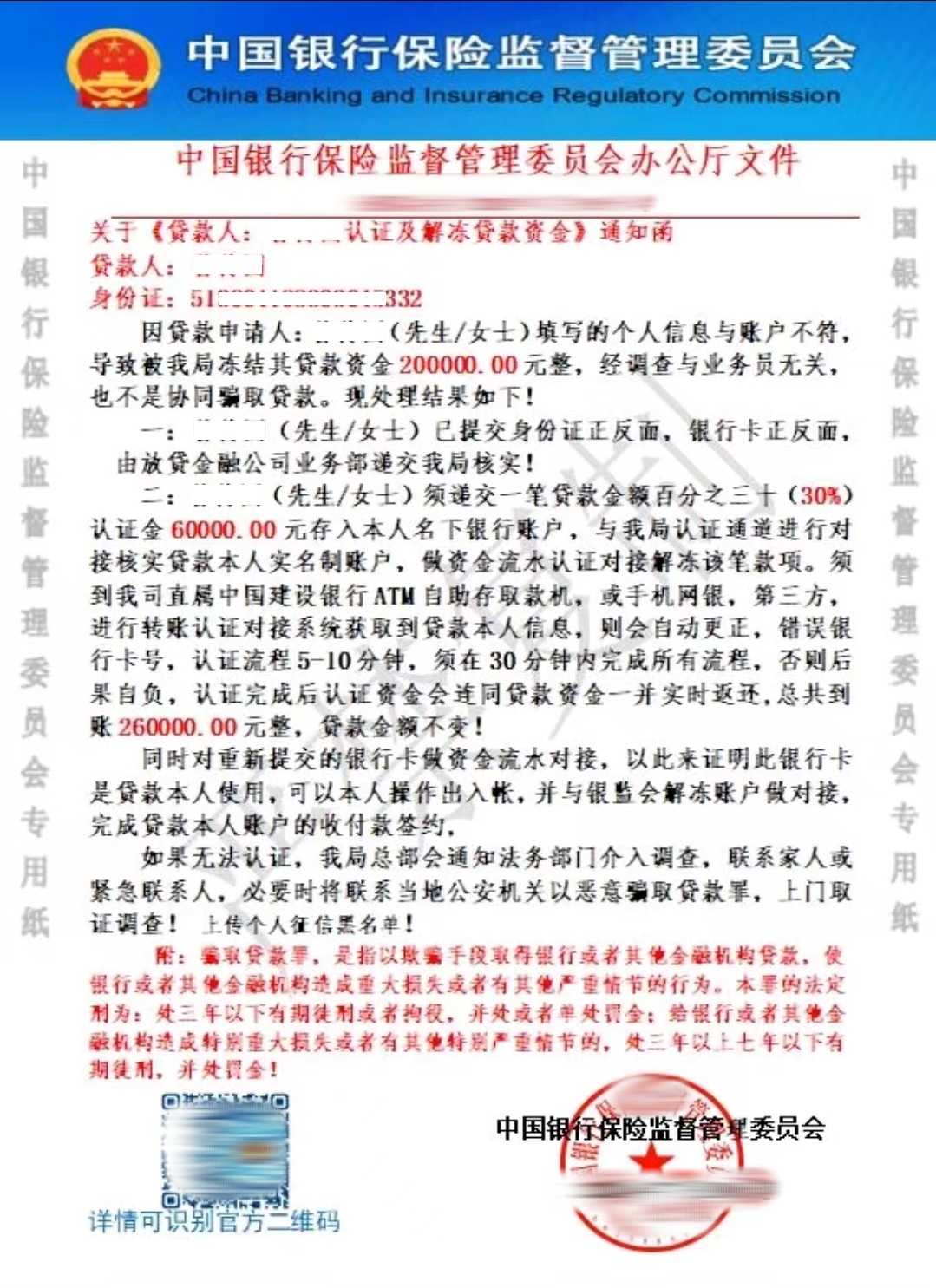 同时,对方还发来一个落款为“中国银行保险监督管理委员会”的“通知函”,告诉我如果不解冻,要上征信黑名单,所有的损失都要我负责。