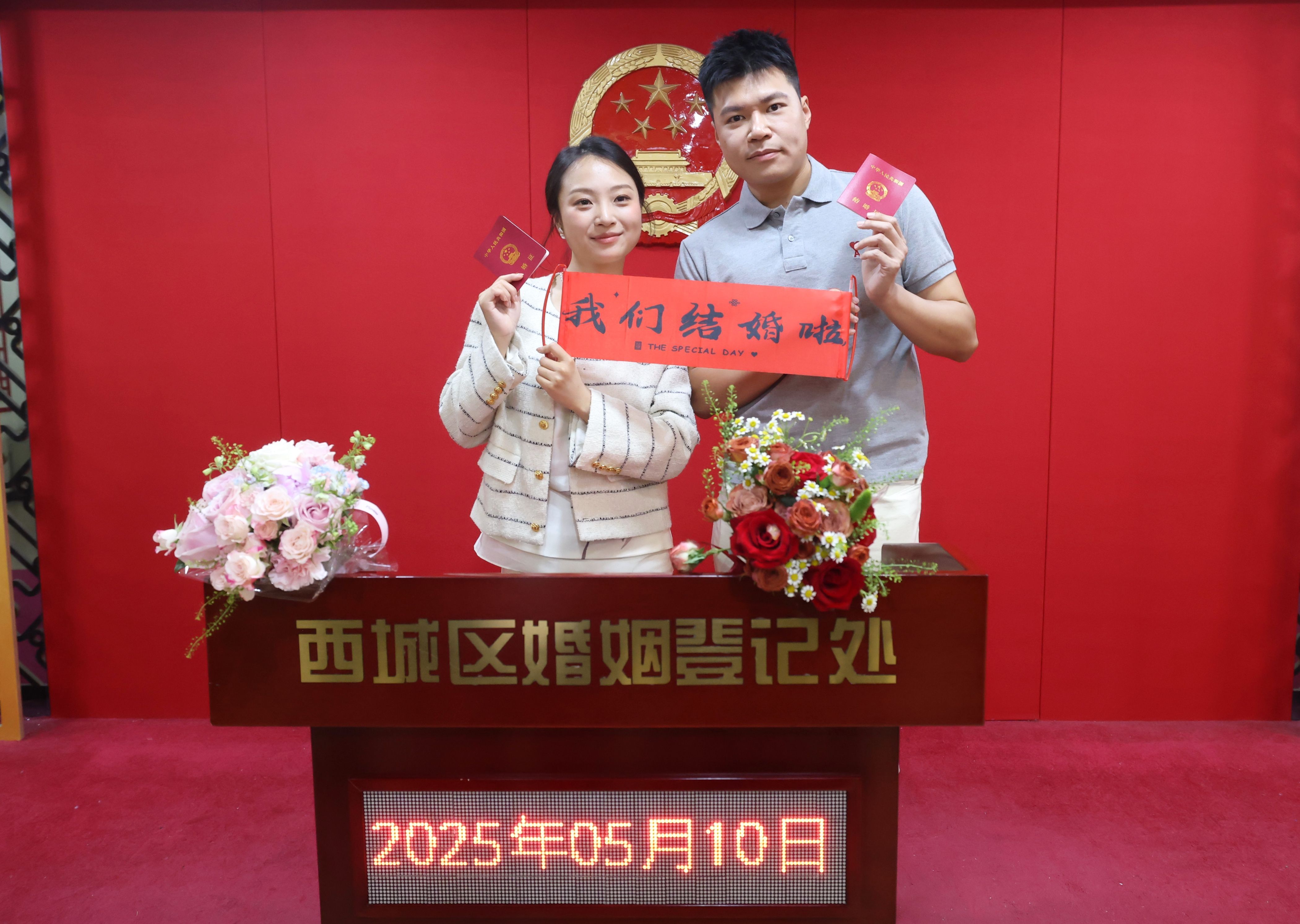 于越表示,新条例的颁布,极大方便了非京籍人员在京结婚,在新条例颁布并实施之前,他们需要回到户籍地办理登记,至少耽误一天的时间。“我们关注到今天是新条例生效第一天,也是婚姻登记‘全国通办’正式启动的首日,所以就第一时间预约了。我们打车来花了十几分钟,领证几分钟就完成了,非常方便快捷。”谷金泽说,今天对他们来说是意义重大的一天,能见证国家便民政策正式落地的重要时刻,他们也感到很荣幸。