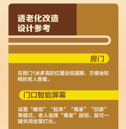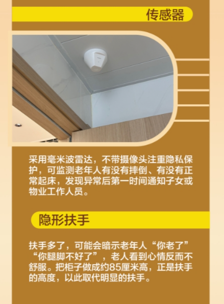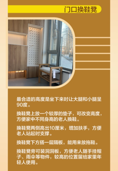 在房门1米多高的位置设低猫眼,方便坐轮椅的老人查看;换鞋凳两侧有扶手,能让老人站起时有支撑……这些年轻人想不到的细节,恰恰是老年人居家生活迫切需要的。