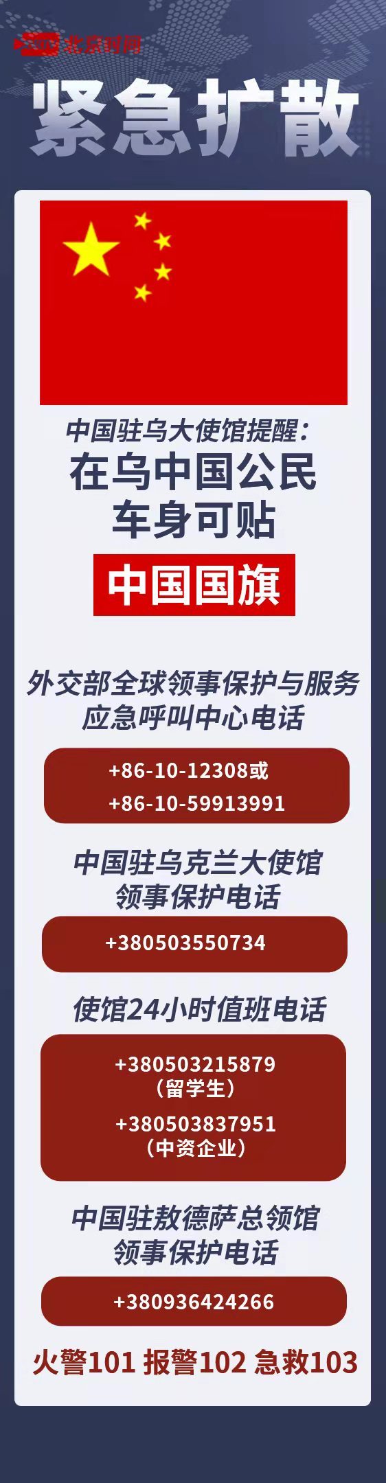 今天(2月25日)下午,在外交部例行记者会上,发言人汪文斌表示,为在当前局势下积极做好保护在乌中国公民的安全工作,中国驻乌克兰大使馆正开展在乌中国公民信息登记工作,以确保紧急情况下为在当地的中国公民提供一切必要协助,全力保护他们的安全。此前,中国驻乌克兰大使馆已发布通知称,将分批包机接返在乌中国公民。即日起至当地时间2月27日晚12点,进行人员登记,后续安排请第一时间关注使馆发布的通知。在此提醒在乌中国公民,如遇紧急情况,可拨打外交部全球领事保护与服务应急呼叫中心电话、中国驻乌克兰大使馆领事保护电话、使馆24小时值班电话、中国驻敖德萨总领馆领事保护电话及乌克兰紧急求助电话↑↑↑