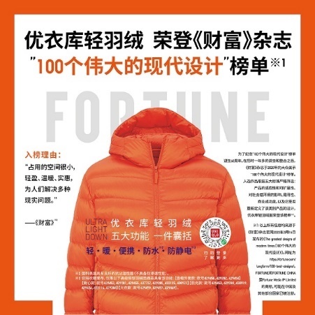 优衣库轻羽绒 荣登《财富》杂志“100个伟大的现代设计”榜单
