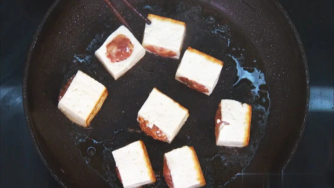 锅中少油,下入豆腐块六面煎制均匀上色。