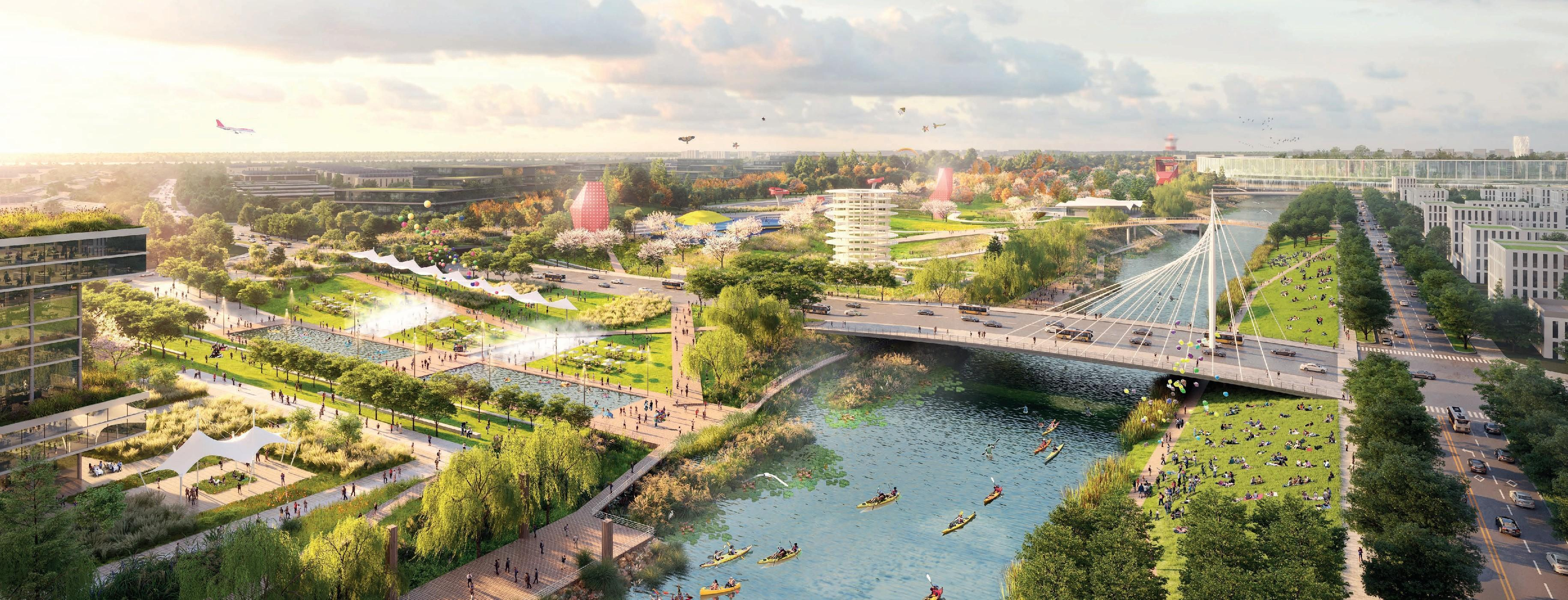 国际会展消费功能区位于大兴机场临空区礼贤片区,距大兴机场约4公里,占地面积约7.8平方公里。在这里,未来将建设起临空区两大平台引擎——国际会展中心和国际消费枢纽项目。目前,两个项目规划选址方案已确定,国际会展中心位于城际铁路联络线礼贤站,首期建设20万平方米,定位为国际交往新载体、大国首都城市新客厅、京津冀协同发展新平台、服务贸易和数字经济新引擎;国际消费枢纽位于礼贤站南侧,占地面积57公顷,定位为空港型国际消费枢纽。