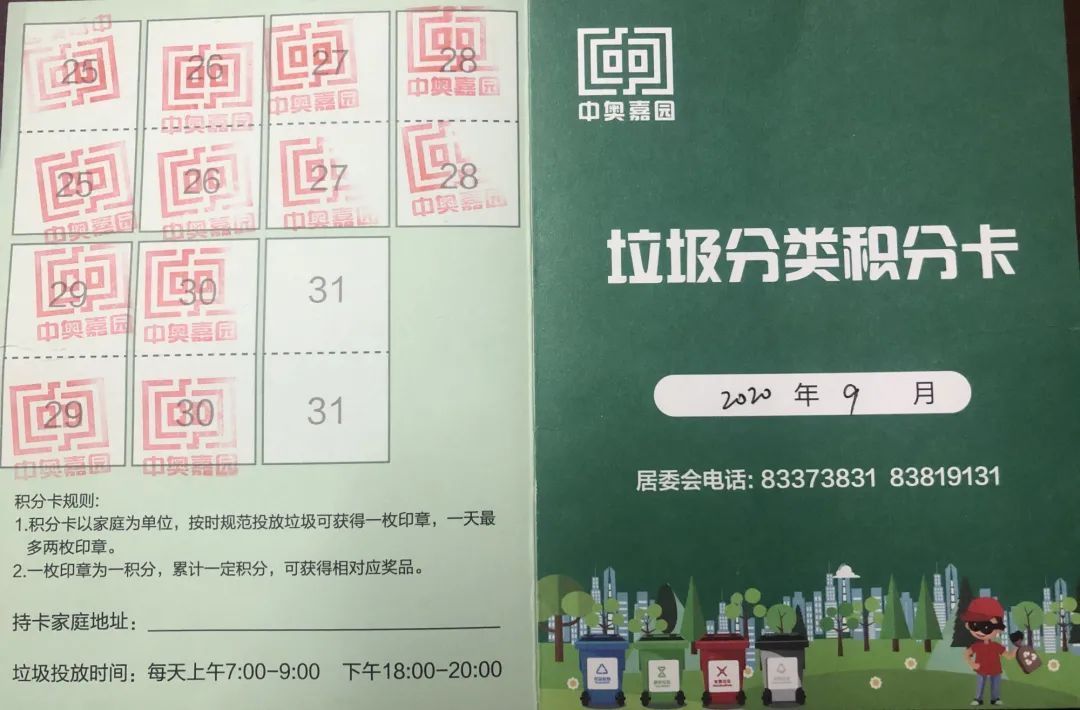 为了能够鼓励居民们正确分类、按时投放垃圾,长辛店街道中奥嘉园社区工作人员为居民们制作了以家庭为单位的垃圾分类积分卡。
