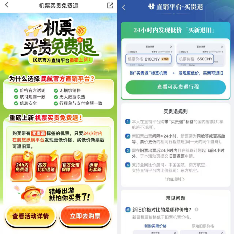 3月29日将进行航班换季,机票价格变化较快。近期,为维护旅客权益,三大航推出机票“买贵免费退”服务,旅客可在航旅纵横民航官方直销平台购买带有“买贵退”标识的机票产品,若在出票后24小时之内发现同一航班的机票更便宜,即可购买便宜的机票,并通过航旅纵横APP内专属服务页面提交退旧票申请。最后建议旅客在购买机票后,使用航旅纵横机票验证服务,以此进行客票验真以及票价税费查询。