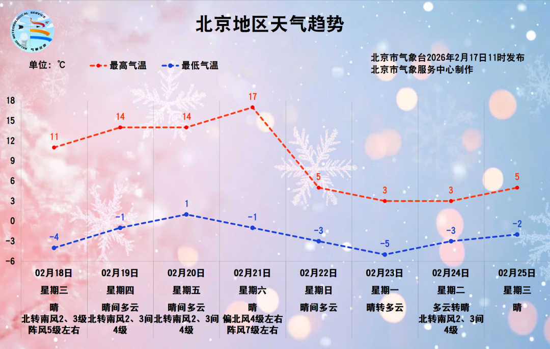 2026年2月18日至2月25日白天最高气温3~17℃,夜间最低气温-5~1℃。