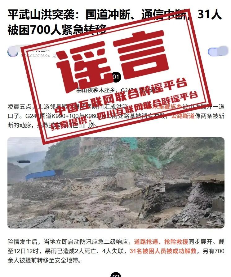 详情:近日,有网民在网络平台发布“平武山洪突袭:国道冲断、通信中断,31人被困700人紧急转移”相关信息,称平武县木座藏族乡发生山洪,G247国道两处路基被冲毁,引发关注。经四川省绵阳市平武县木座藏族乡人民政府核实,近期当地未发生山洪灾害。相关内容实为2022年7月12日木座藏族乡特大山洪灾害的旧闻报道,并非近期发生灾害。发帖人移花接木、断章取义,误导公众。(来源:四川互联网举报辟谣平台)