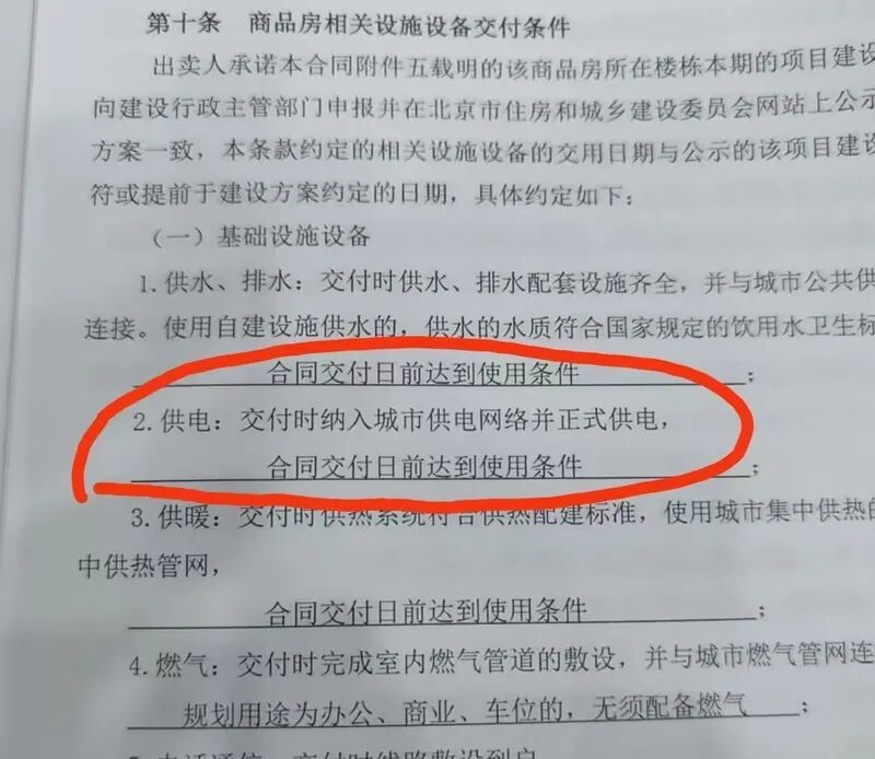 在徐先生提供的房屋购买合同中明确写着,商品房供电设施交付时纳入城市供电网络并正式供电。如今房屋已经交付一年多,业主们盼着尽快能兑现“迟到的诺言”。