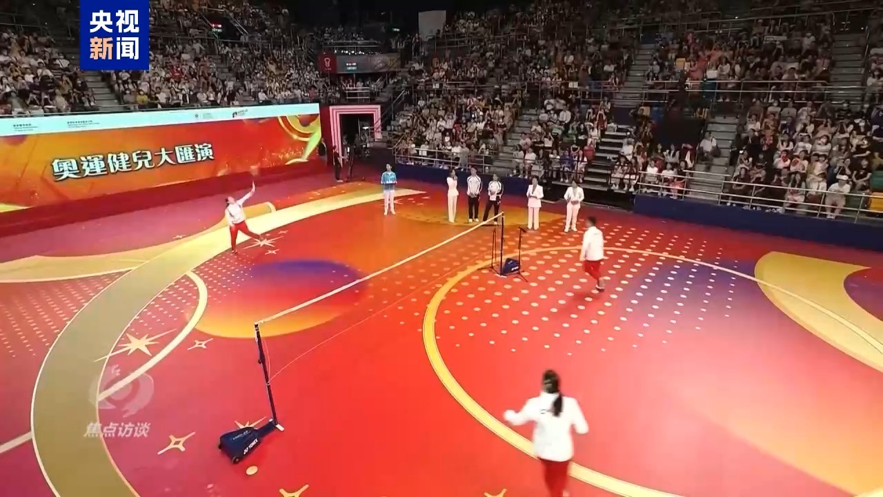 中国羽毛球队在巴黎奥运会上也有着出色的发挥,收获了2枚金牌、3枚银牌。他们给大汇演带来的是趣味接力表演赛,4名队员需要绕着球网转圈并接到对面打来的羽毛球。