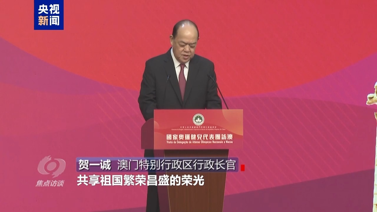 澳门特别行政区行政长官 贺一诚:代表团到访澳门,与大家分享胜利的喜悦,共享祖国繁荣昌盛的荣光,又一次点燃了澳门居民的奥运热潮,激发了社会各界的爱国热情和民族自豪感。
