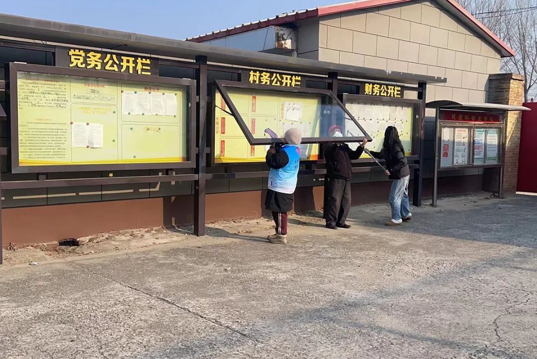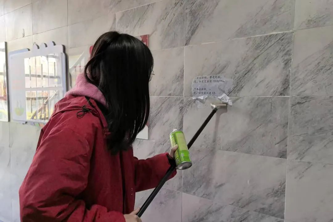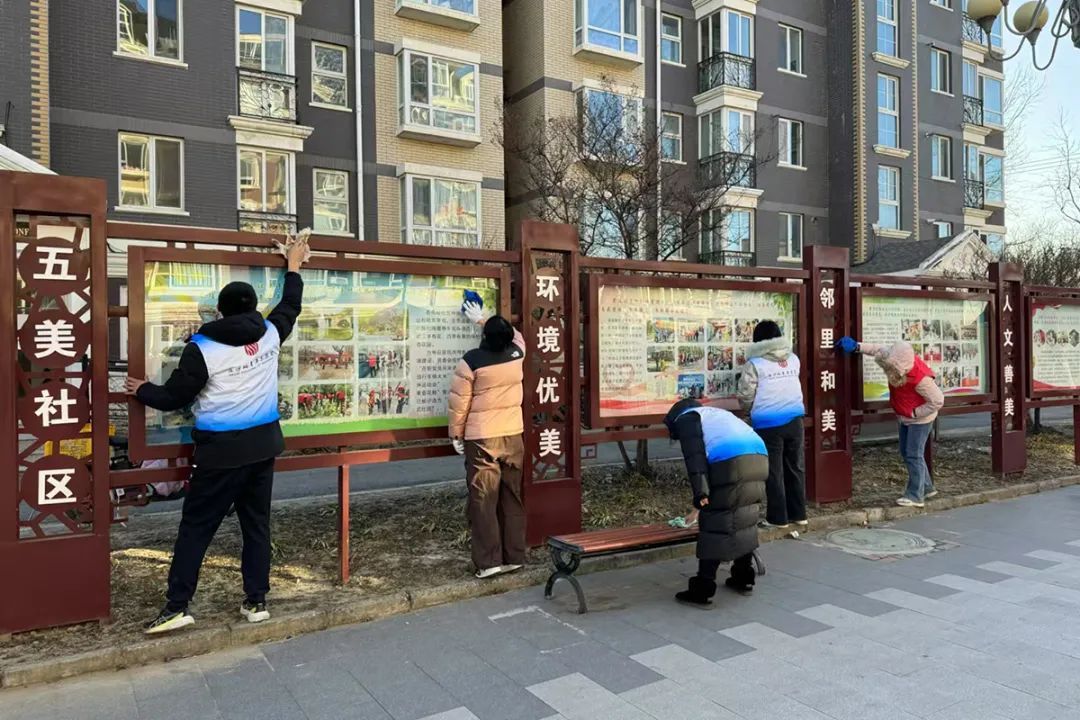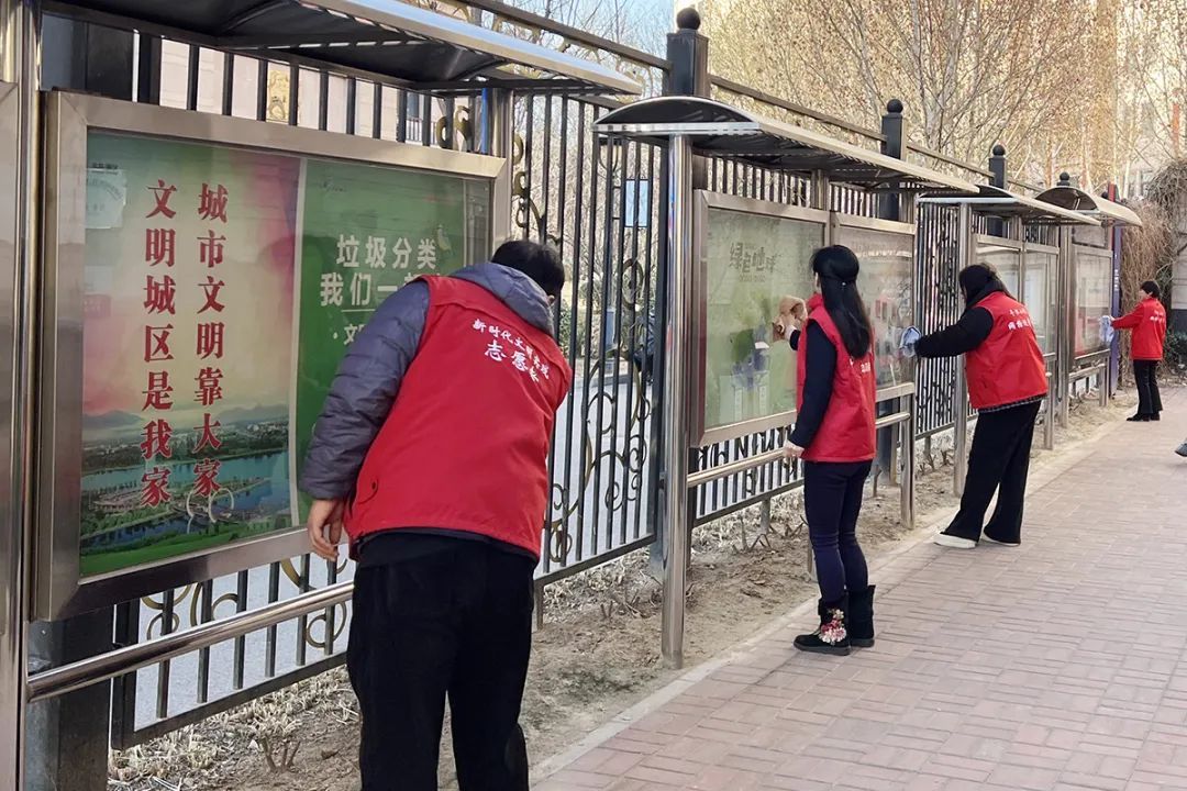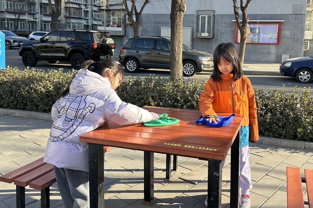 居民和社区工作人员擦拭公共桌椅、宣传栏。