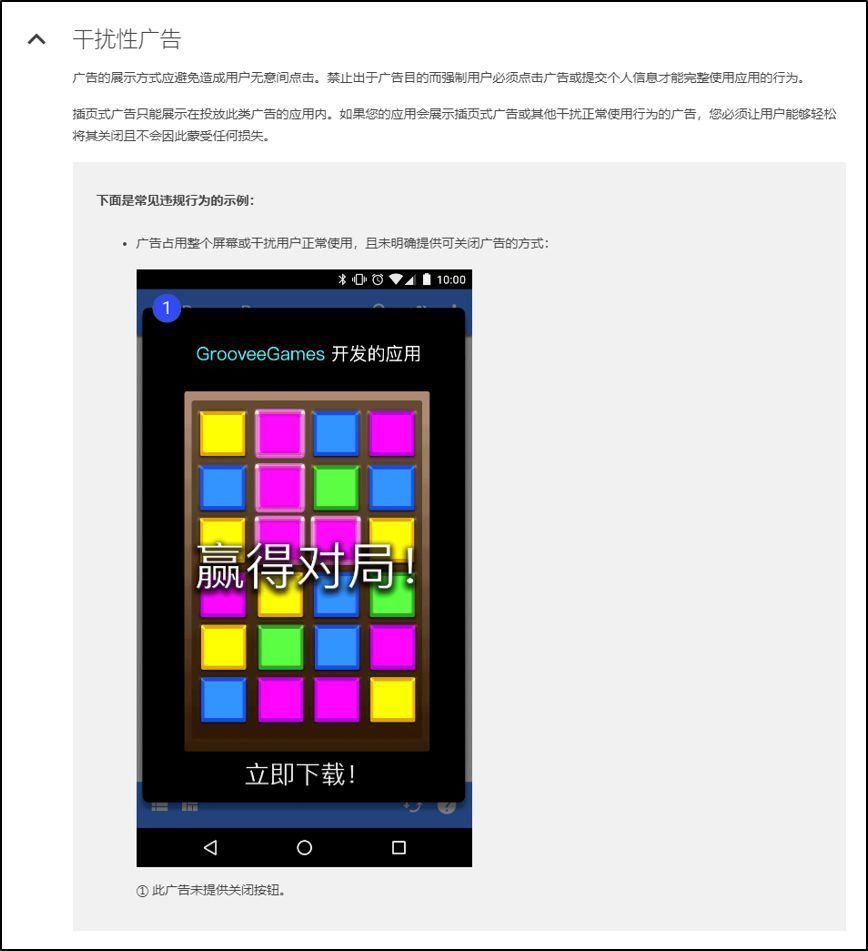 插页式广告只能展示在投放此类广告的应用内。如果App会展示插页式广告或其他干扰正常使用行为的广告,谷歌要求开发者必须让用户能够轻松将其关闭,且不会因此蒙受任何损失。