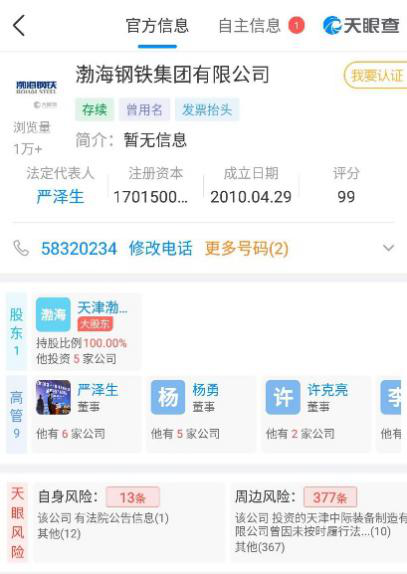 2010年天津四大钢铁企业合并后,严泽生出任渤钢集团党委副书记、总经理至今。时间财经查阅天眼查发现,严泽生还为渤钢集团法人代表,并担任6家公司董事。