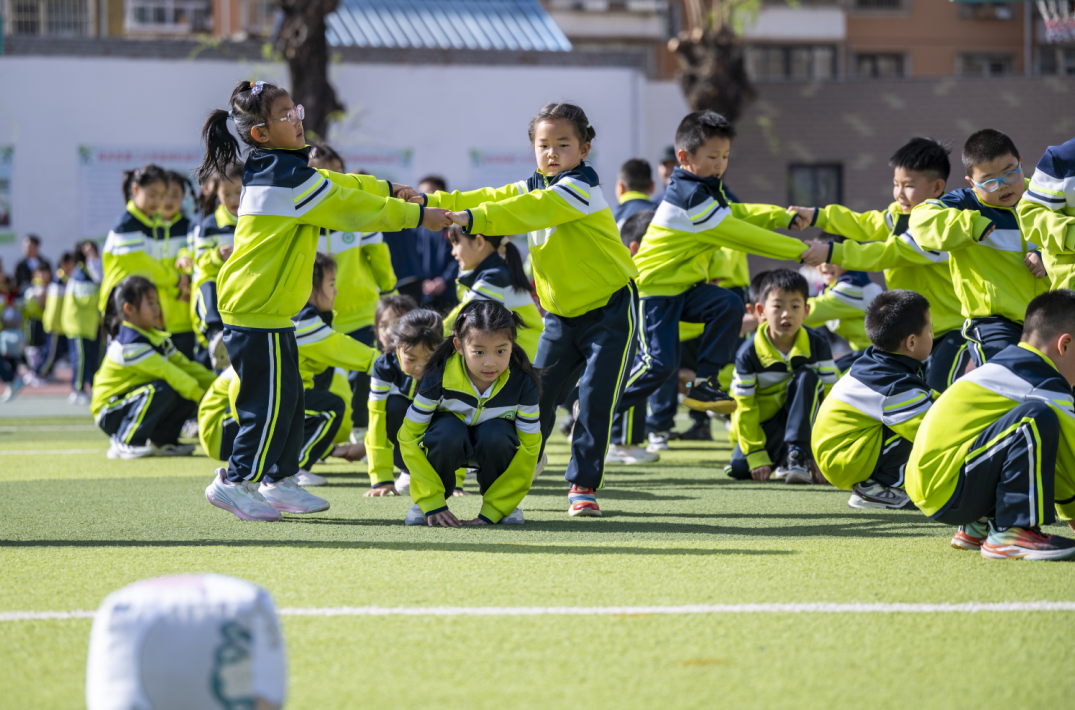 操场上,低年级设置了“小青蛙跳荷叶”“螃蟹顶球接力”“钻山洞”等游戏,孩子们小小的身躯灵活地在游戏道具间穿梭,稚嫩的脸上洋溢着纯真的笑容。