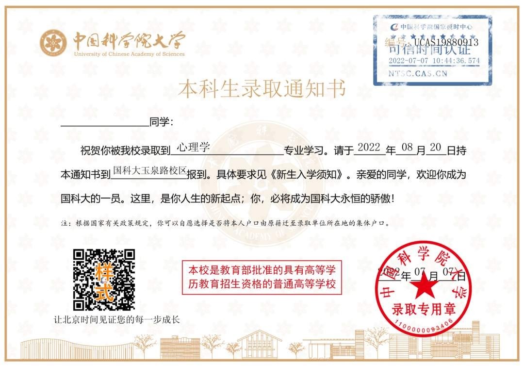 考生通过扫描通知书里的二维码,通过扫描就能看到一枚专属的“时间戳”,它显示的是考生被正式录取时的毫秒级时刻。