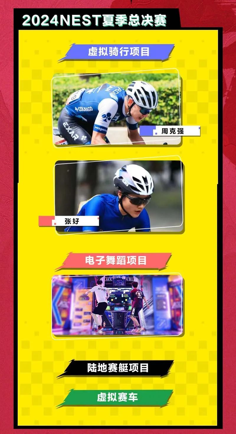 京西电竞节引入2024NEST全国电子体育大赛夏季总决赛,比赛项目涵盖虚拟骑行、陆地赛艇、电子舞蹈、虚拟赛车等项目。来自全国各地各项目的优秀运动员将齐聚首钢园区,带领观众在现场充分感受专业、顶级的虚拟体育赛事体验。届时,2023NEST全国电子体育大赛虚拟骑行女子组冠军张好和男子组冠军周克强,也将现身赛场,展开巅峰对决。