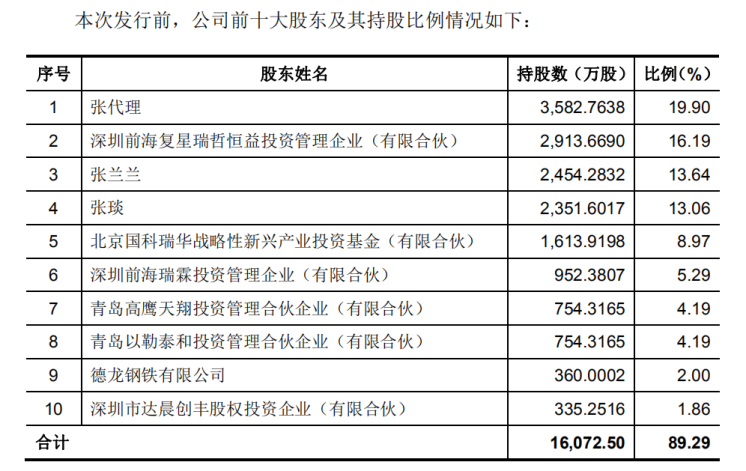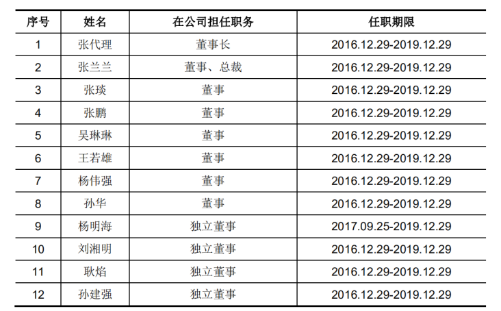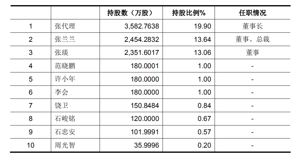 2017年5月,张代理、张兰兰、张琰三位股东共同签署《一致行动协议》,成为一致行动人。招股书显示,张代理与张兰兰为父女关系、张代理与张琰为父子关系,张兰兰与张琰为姐弟关系。在任职方面,张代理目前担任公司董事长,张兰兰担任董事及总裁,张琰担任董事。