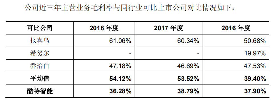 此外,在过去三年间,酷特智能主营业务毛利率分别为37.90%、38.79%、36.28%,出现一定程度波动,且远低于行业平均水平。关于2018年毛利率下跌,酷特智能在招股书中将其归因于汇率下降及用工成本上升等因素影响。
